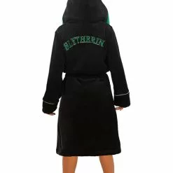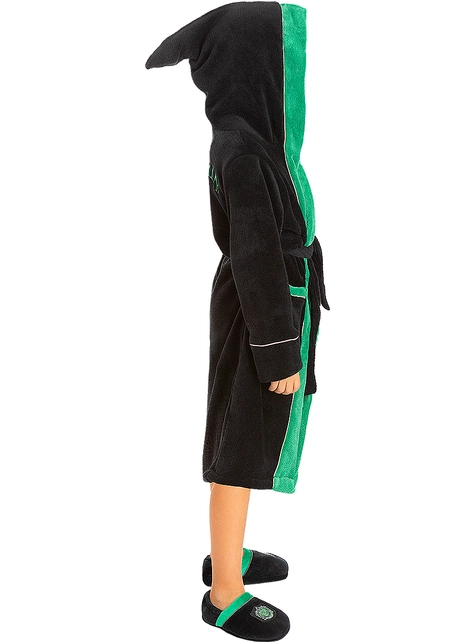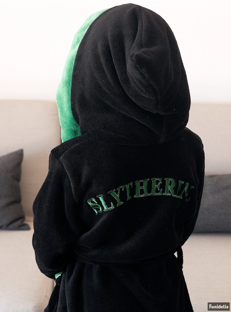 De aspecto similar al de la túnica de Slyhterin, esta bata infantil para estar por casa tiene capucha y es un albornoz polar de color negro y el verde de Slyhterin. Y, además, incorpora el escudo de la serpiente de Slyhterin y el nombre de la casa en la espalda.