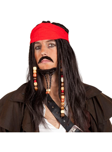 Incluye un una peluca larga y lacia color castaño, un bigote y una barba del mismo color y una bandana pirata color rojo.