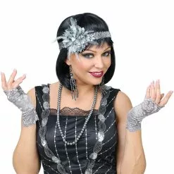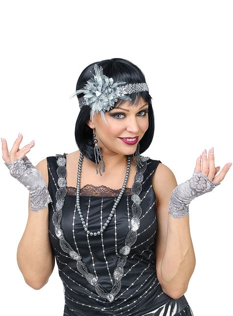 Incluye: cinta para la cabeza, pendientes con perlas y guantes sin dedos