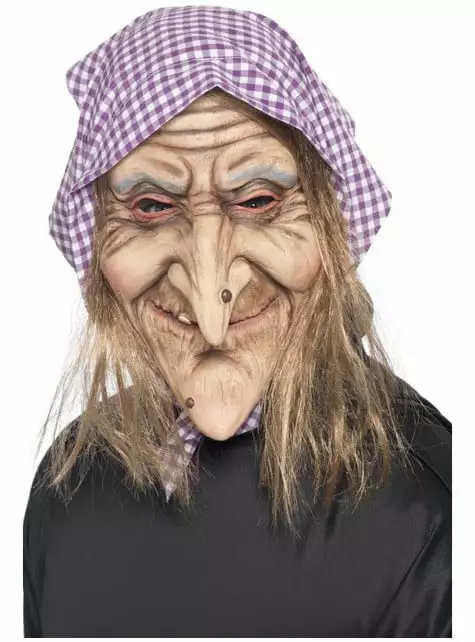 Incluye una máscara de bruja vieja con verruga, con pelo y pañuelo para la cabeza.