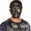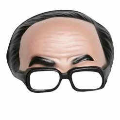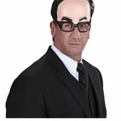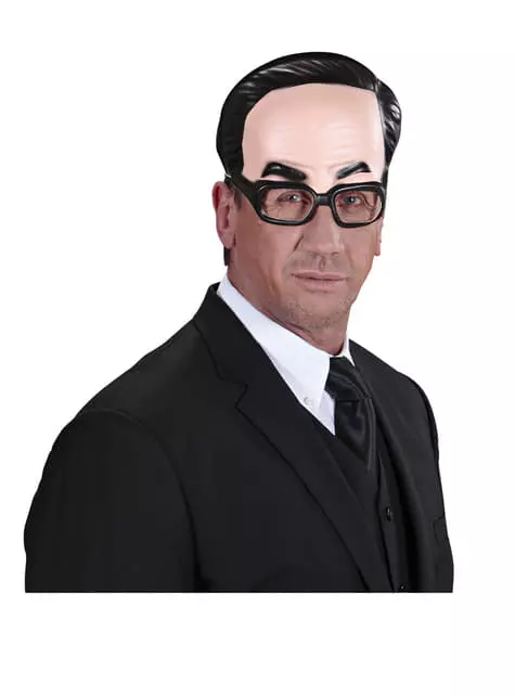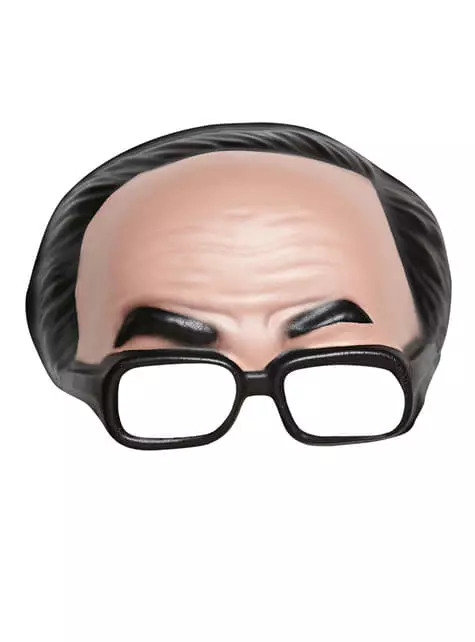 Incluye una máscara de media cara, sin mentón, con cabellos y cejas negros y gafas.