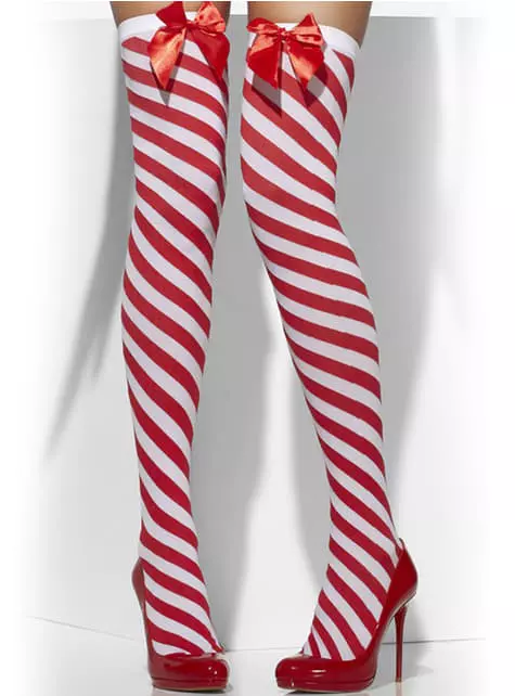 Incluye unas medias blancas hasta el muslo con rayas rojas en espiral y lazos rojos.