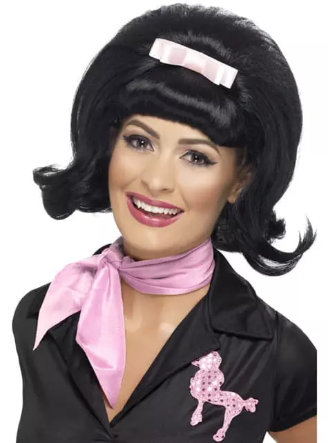 Incluye una peluca morena con corte bob ahuecado de los años 50 con lazo rosa.