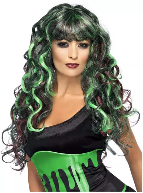 Incluye una peluca larga y ondulada con flequillo de color negro con mechas verdes.