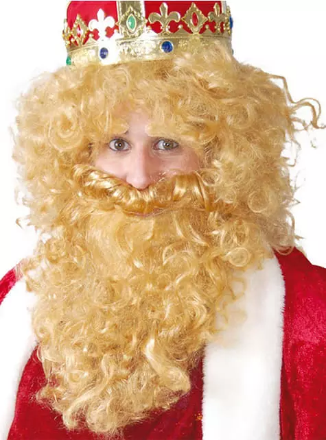 Incluye una peluca rizada de pelo rubio dorado con gran bigote y espesa barba que te hará reconocible como el Rey Gaspar.