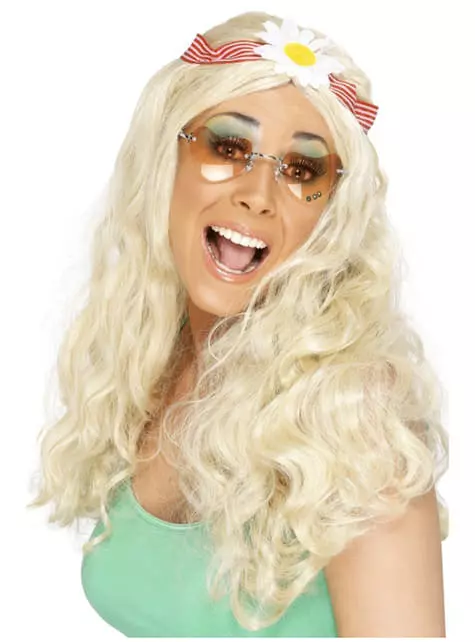 Incluye peluca ondulada rubia con una banda para el pelo y una margarita.