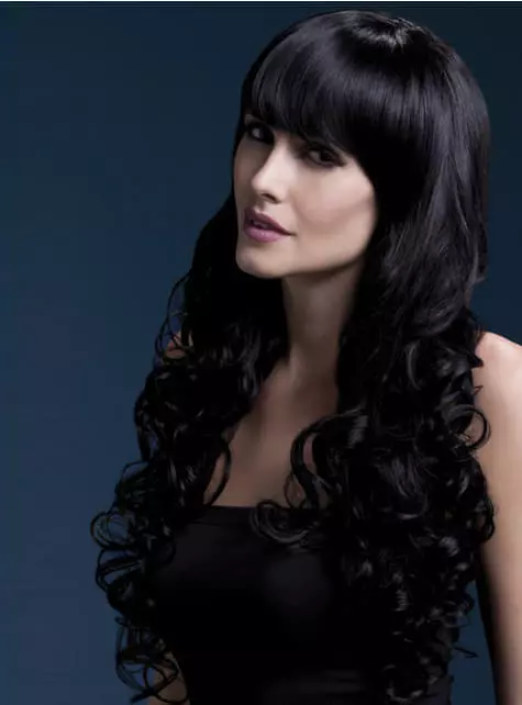 Incluye una peluca larga ondulada, 66 cm. con flequillo recto de color negro.