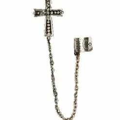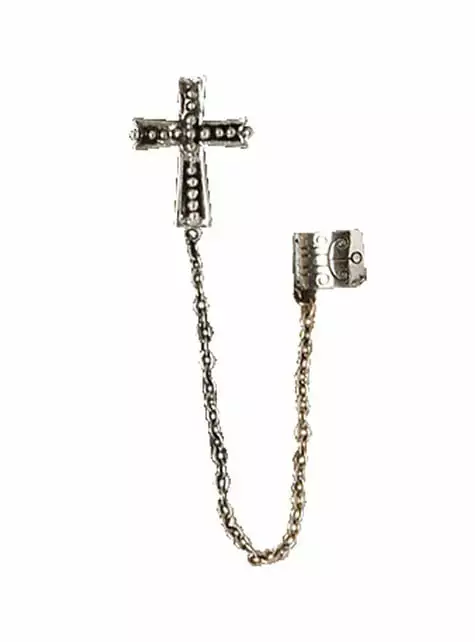 Incluye un pendiente con forma de cruz gótica, con una cadena colgante que se engancha por el otro extremo a la oreja, simulando dos pendientes en uno.