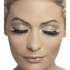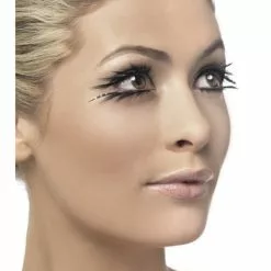 Incluye unas pestañas negras de parte inferior y superior con brillos y contiene pegamento.