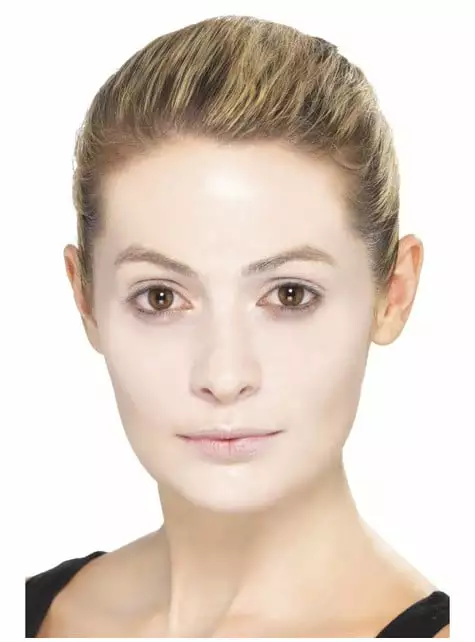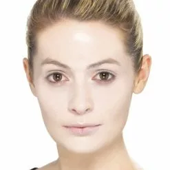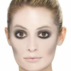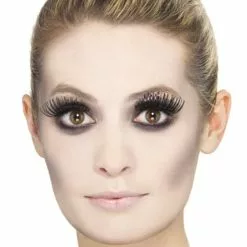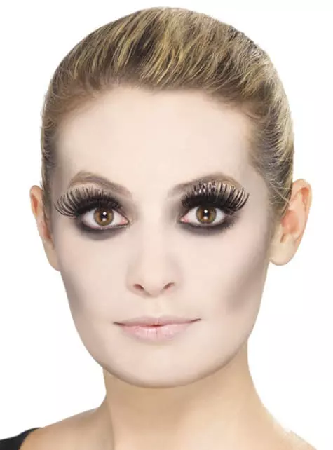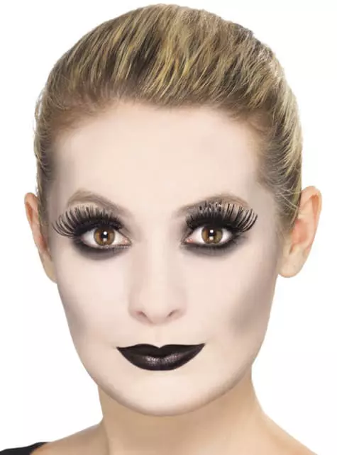 Incluye maquillaje facial en tonos oscuros, barra de labios y pestañas postizas.