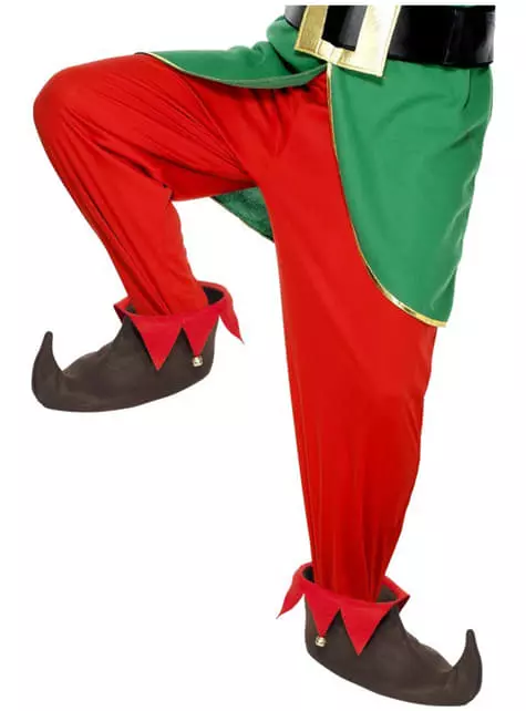 Incluye un par de puntiagudos zapatos marrones y rojos con cascabel.